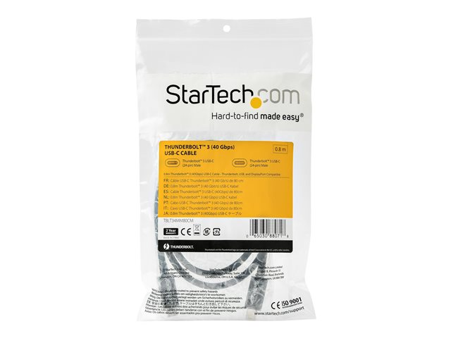 StarTech.com 2.6ft (80cm) Thunderbolt 3 Cable, 40Gbps, 100W PD, 4K/5K Video, Thunderbolt-Certified, Compatible w/ TB4/USB 3.2/DisplayPort - Thunderbolt-kabel - USB-C (hann) til USB-C (hann) - Thunderbolt 3 / USB / DisplayPort - 80 cm - 4K-støtte, 5K-støtte - svart - for P/N: PEXUSB321C