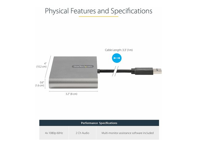 StarTech.com USB 3.0 to 4 HDMI Adapter, External Video & Graphics Card, USB Type-A to Quad HDMI Monitor Display Adapter Dongle, 1080p 60Hz, USB 3.0 to HDMI Adapter/Video Converter, Windows - Multi Monitor Adapter - Adapterkabel - USB-type A hann til HDMI hunn - 1 m - romgrå - 1080p støtte 60 Hz
