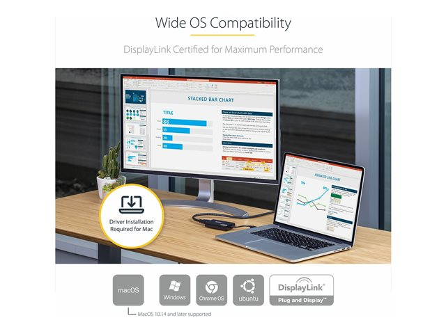 | Tilpassede standarder | WHQL, FCC, RoHS, WEEE, REACH, DisplayLink Plug and Display, RCM |