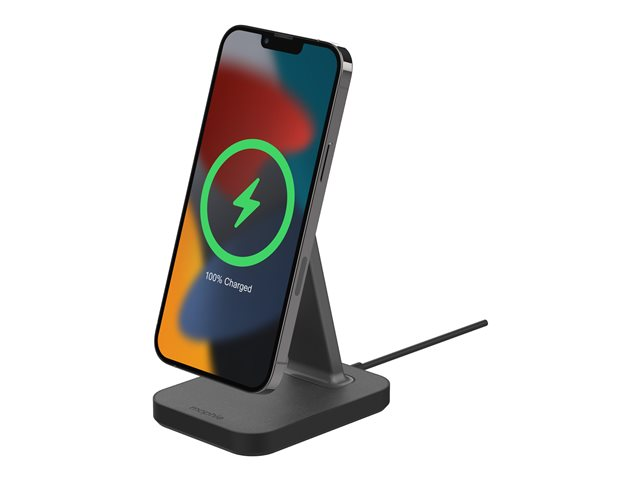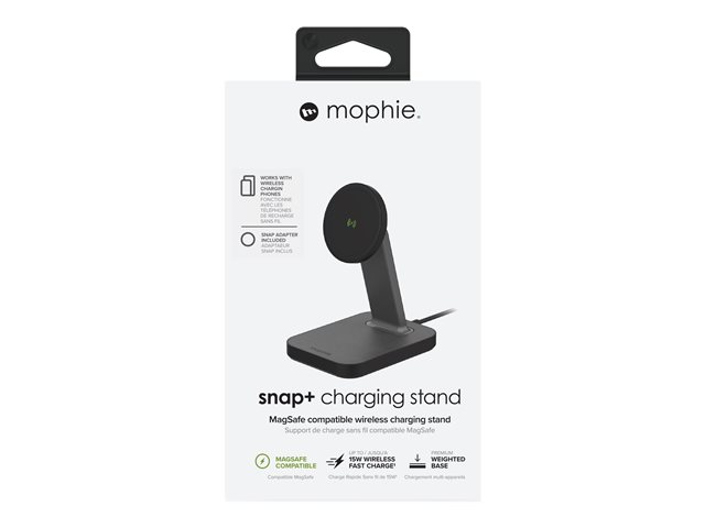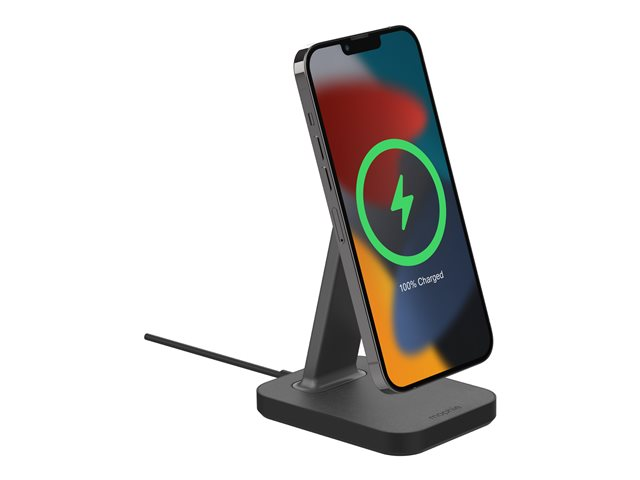 Forbedre bekvemmeligheten ved lading. Den MagSafe-aktiverte Snap+-laderen holder telefonen oppreist samtidig som den leverer opptil 7,5-15W trådløs kraft. Settet inkluderer også en snap-on-adapter som lar ikke-MagSafe-kompatible telefoner festes til stativet ved hjelp av magneter. Telefonen klikker umiddelbart på plass og lading starter ved kontakt. Snap+-laderen holder telefonen over rotet på skrivebordet, slik at du kan videochatte, se filmer eller skanne meldinger mens telefonen lades.