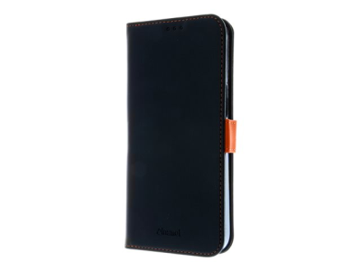 Insmat Exclusive - Lommebok for mobiltelefon - ekte skinn, polykarbonat, kartong+papir+aluminiumsfolie, bomullssting - svart / oransje - for Apple iPhone 15 Pro Max