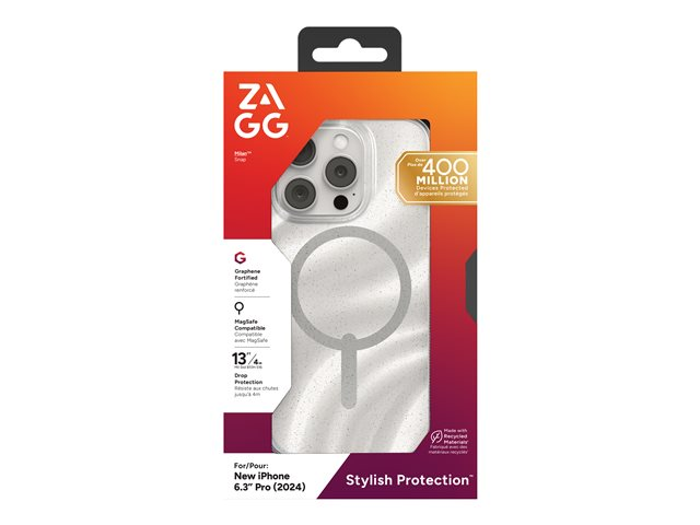 Protective cover is engineered for the ZAGG Milan Snap, designed to blend aesthetics with functionality. Made from lightweight graphene, this back cover features an iridescent finish that supports wireless charging. It provides a secure grip and a slim design that enhances the overall handheld experience. With MIL-STD 810G 516 compliance, users can enjoy drop protection and peace of mind while using their device. This case is made from recycled materials, aligning with a more sustainable product choice.