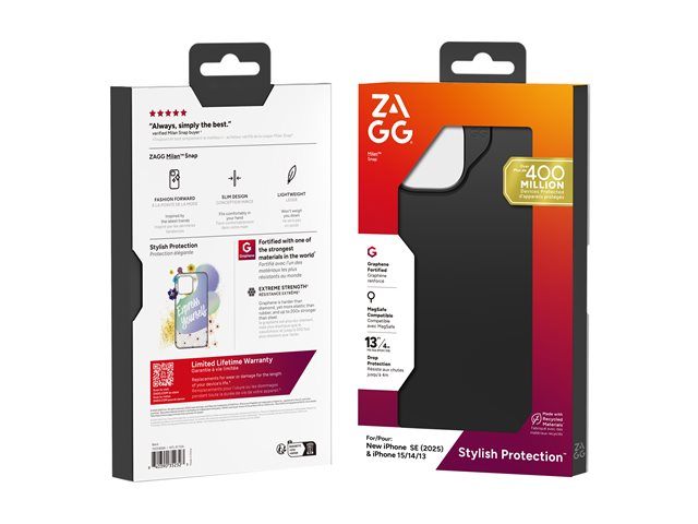 The ZAGG Milan Snap is a protective cover designed for cell phones, offering a slim and lightweight profile for convenience. This back cover ensures a secure grip with its non-slip design, making it user-friendly in various situations. Crafted with graphene lining, the case supports wireless charging and features a silk-touch finish for comfort. Its drop-resistant and scratch-resistant properties adhere to MIL-STD 810G 516 standards, providing reliable protection from accidental drops up to 4 m. The ZAGG Milan Snap offers protection along with an eco-conscious design featuring 84% post-consumer recycled content.