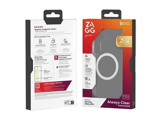 The Zagg Crystal Palace Snap is designed to provide protection for cell phones while maintaining style and functionality. This protective cover features a back cover design that incorporates graphene lining material, enhancing durability and aiding in wireless charging. With a non-slip grip, users can have confidence knowing their device is secure in hand. The case offers comprehensive yellowing and scratch protection, ensuring the device remains in good condition. Made from 61% post-consumer recycled content, this case safeguards your phone and supports sustainability efforts.