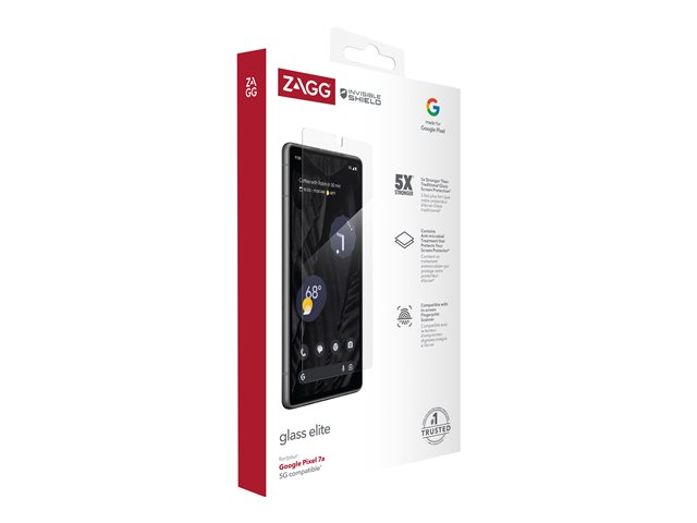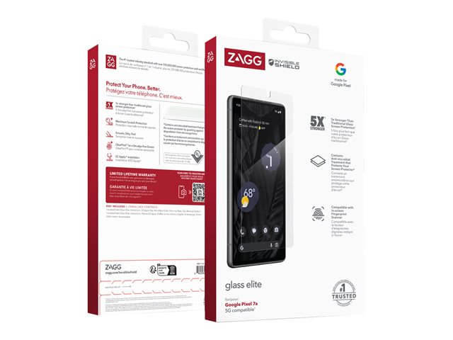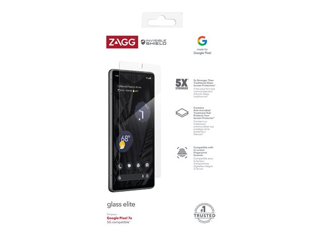 Glass Elite for the Google Pixel 7a is 5x stronger than the average screen protector. Glass Elite contains anti-microbial properties that protect the screen protector by protecting against degradation from microorganisms. Ion exchange technology increases surface compression for increased strength and scratch-resistance. ClearPrint Technology, an oil-dispersing treatment exclusive to Glass Elite, disperses the oil from your fingerprints, making them nearly invisible. EZ Apply tabs and a drop-in installation tray make applying your InvisibleShield simple and accurate.