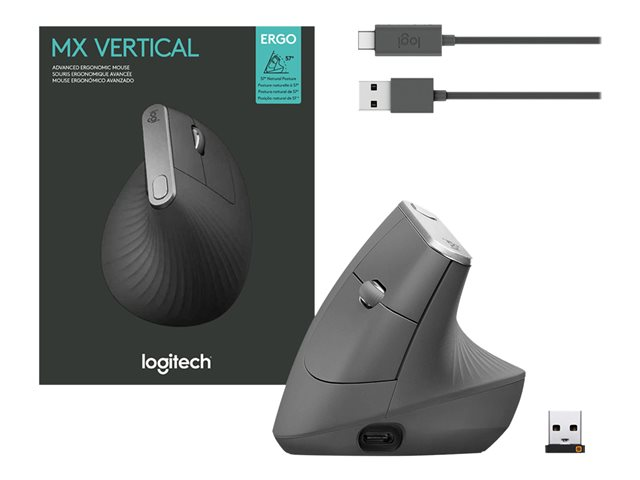 Logitech MX Vertical - Vertikal mus - ergonomisk - optisk - 6 knapper - trådløs, kablet - Bluetooth, 2.4 GHz - USB trådløs mottaker - grafitt
