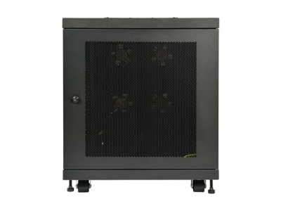 The SRX12UBFFD has an IP54 (NEMA 12) protection rating, protecting sensitive equipment against dirt, dust, lint, oil, drips and splashes. Its pre-installed air filter and louvered vents on the front door prevent dripping water, oil and airborne contaminants from getting inside. You can replace the air filter with standard, off-the-shelf furnace filters. Four high-performance intake fans built into the front door pull filtered air through the cabinet to keep your equipment cool.