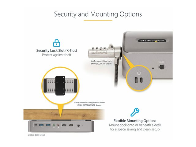 The StarTech.com Dual-Laptop USB-C KVM Docking Station is a comprehensive solution designed to enhance your productivity and connectivity. With dual monitor support at 4K 60Hz, it offers clarity and smoothness for all your visual needs. The docking station provides efficient power delivery, with 90 W for the active host device and 45 W for the standby, ensuring your laptops are always charged. Multiple USB ports, including USB 2.0 and USB 3.2 Gen 2, along with Ethernet connectivity, allow for the seamless connection of all your essential peripherals and network. Advanced features such as MAC address pass-through, full duplex support, and up to 10Gbps data transfer speeds make this docking station a powerful tool for any professional setup. Additionally, it adheres to several compliance standards, including RoHS and WEEE, and includes both Kensington nano and standard security slots, offering peace of mind and reliability. Whether for work or play, this docking station is designed to meet the needs of demanding multitasking environments.